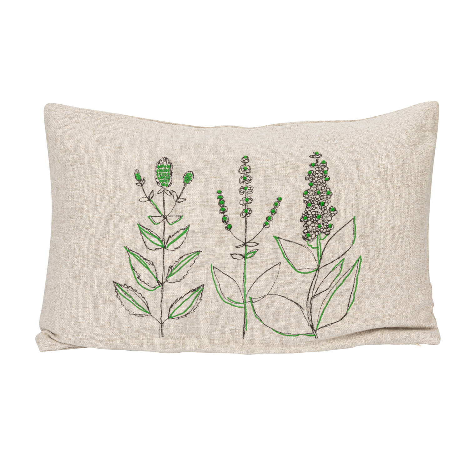 Catalog Name: 24"L x 16"H Linen Blend Printed Lumbar Pillow w/ Botanicals & Hand-Embroidered Kantha Stitch, Natural, Black & Green ©