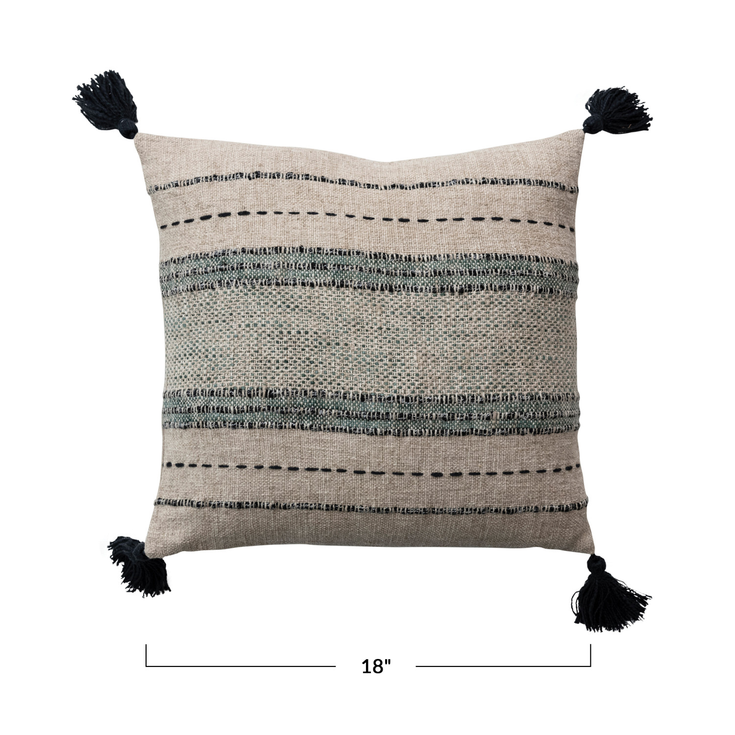 Catalog Name: 18" Square Cotton & Linen Blend Pillow w/ Hand-Embroidered Stripes, Chambray Back & Tassels, Natural, Black & Green