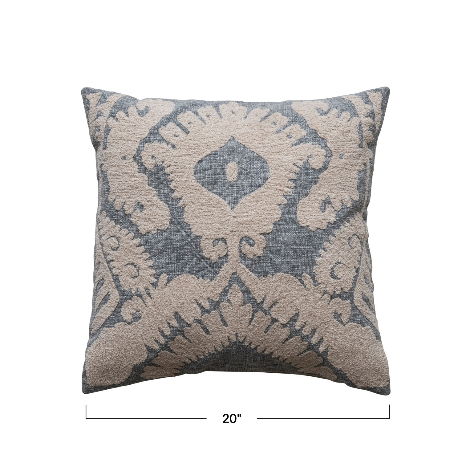 Catalog Name: 20" Square Cotton Slub Tufted Pillow w/ Damask Pattern & Chambray Back, Blue & Cream Color