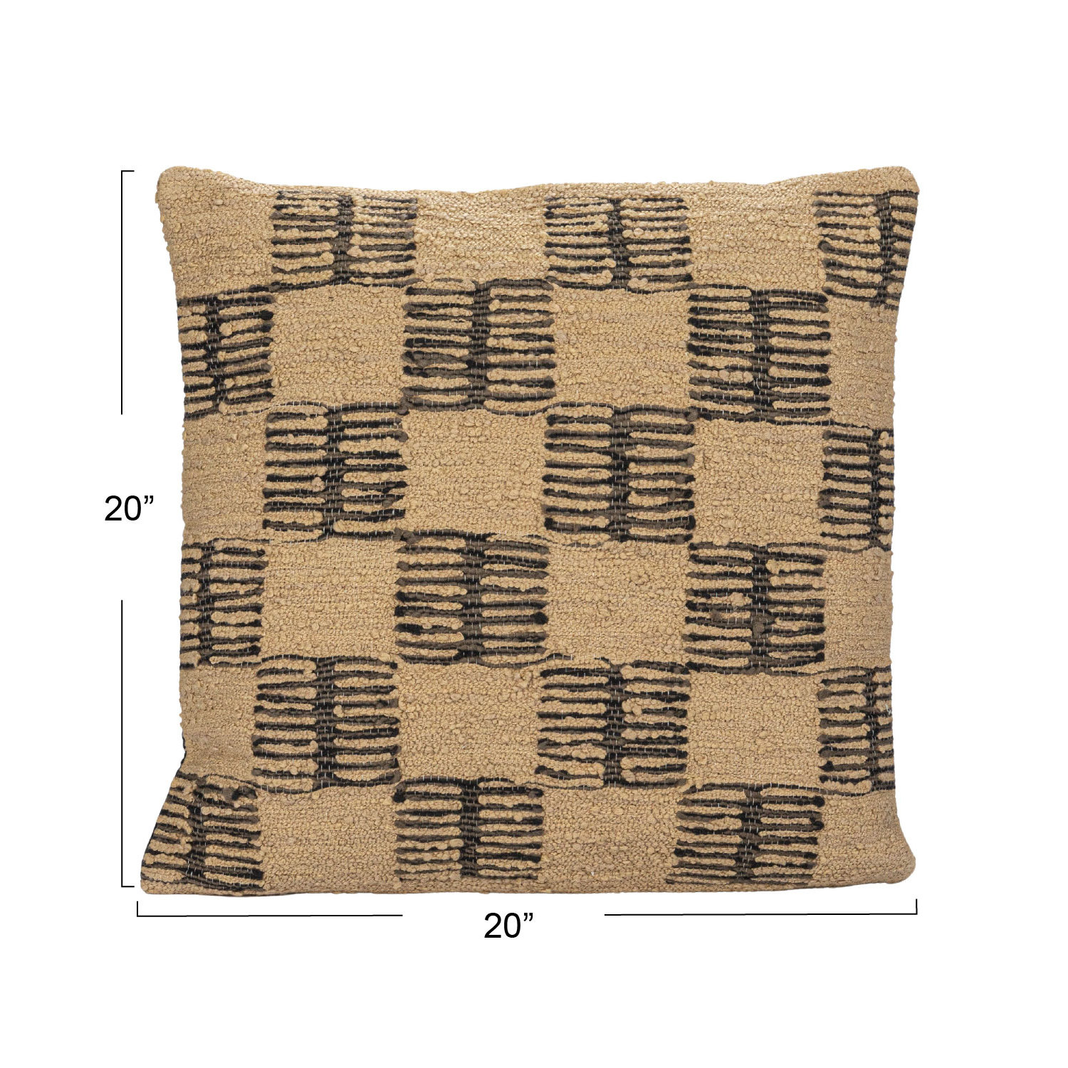 This hand-woven fabric indoor/outdoor pillow features a brown and tan checkered pattern, providing a natural and rustic look. The fabric's subtle texture adds personality to the decor. The pillow is made of polyester for both the cover and fill, making it soft and comfortable. It is suitable for indoor and outdoor use, able to withstand different weather conditions. The pillow measures 20 inches in length and 20 inches in width, making it suitable for most sofas, chairs, or beds. It can add a touch of farmhouse, cottagecore, boho, transitional, or modern style to any space. This versatile accessory is perfect for decorating living rooms, bedrooms, patios, or any other room.