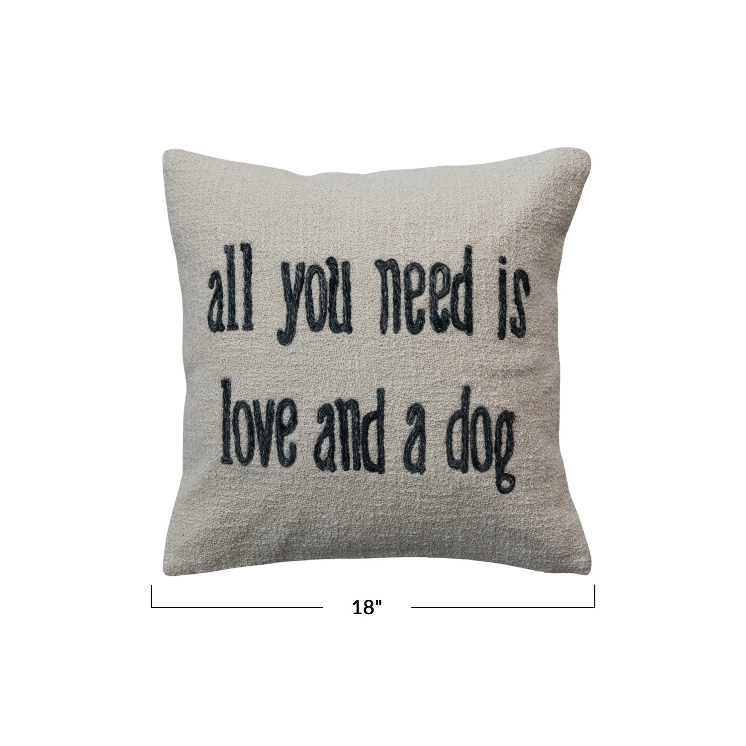 Catalog Name: 18" Square Cotton & Jute Pillow w/ Embroidered "All You Need Is Love And A Dog", Natural & Black