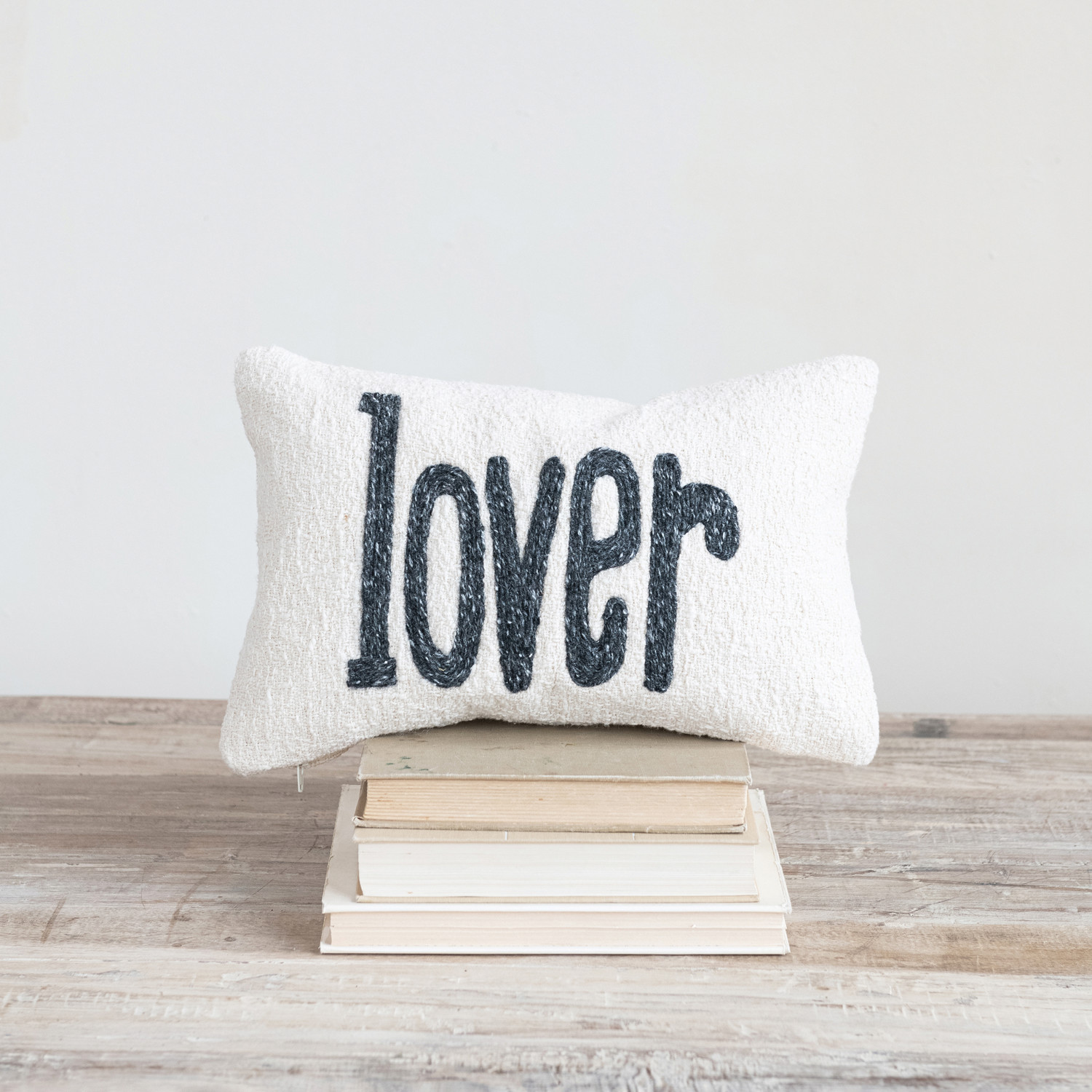 Catalog Name: 14"L x 9"H Woven Cotton Slub Embroidered Lumbar Pillow "lover", Cream Color & Grey Melange