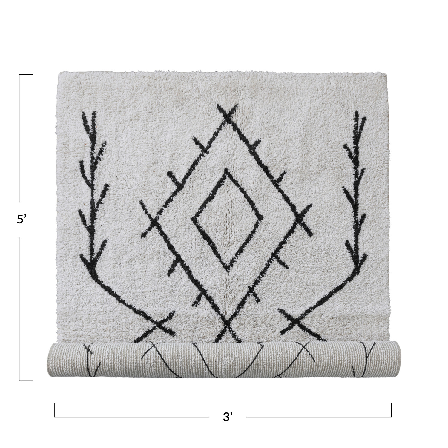 This modern boho rug showcases a geometric print on soft tufted cotton. Black and white tufted cotton geometric print rug. Spot Clean Only. 97% Cotton, 3% Other Fibers.