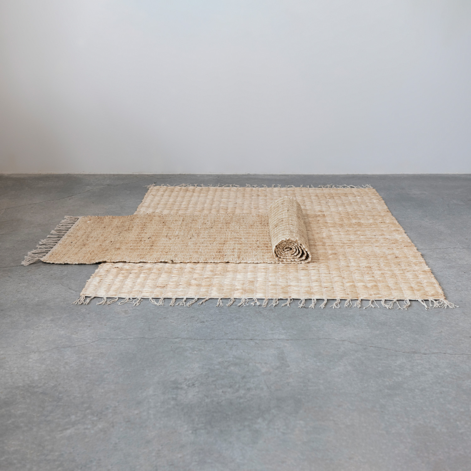 Our thoughtfully curated collection of rugs showcases a wide array of lush woven textures, prints, embroidery, and silhouettes to instantly transform any space. Explore a wide variety of pieces to bring warmth to any space including doormats, patchwork, dhurrie rugs, circle rugs, tufted area rugs, floor runner rugs, and so much more. Choose from vast selection of materials from pieced leather and jute to handwoven cotton and wool, and styles from mid-century modern and global to contemporary boho and traditional farmhouse. Effortlessly bring depth, warmth, and texture to a living space with a thoughtfully placed rug that is sure to impress. This minimalist floor rug features woven bleached jute and cotton adorned with decorative fringe. Display in a living or dining space of any style from farmhouse to Scandinavian. Spot Clean Only. Made from jute and cotton.
