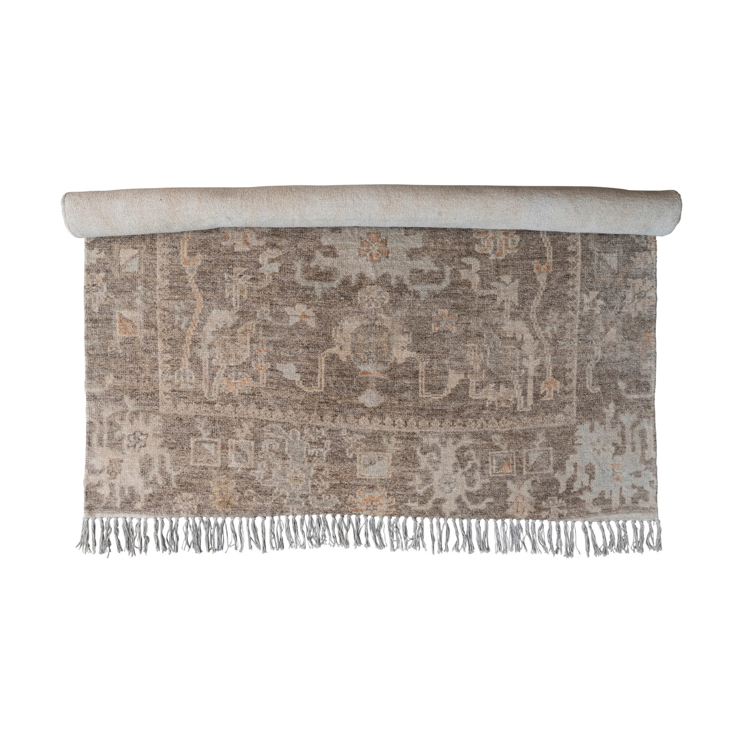 This brown cotton chenille distressed print rug is a cozy and elegant addition to any space. The fabric is soft, durable, and eco-friendly, with subtle variations in tone and texture. The rug features a fringe trim, matching the fabric, adding flair and personality. The rug measures 5 by 7 feet and is easy to care for, making it suitable for farmhouse, French country, traditional, lodge, or global style decor. The rug is machine washable in cold water and gentle cycle. The fringe trim matches the fabric, creating a cohesive look. The rug is easy to care for and can be machine washed in cold water and a gentle cycle. It is a versatile and classic accessory that can create a cozy atmosphere or a simple and elegant vibe.