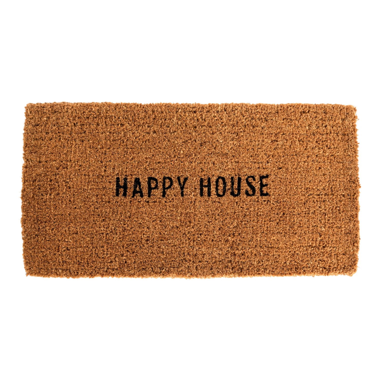 `This "HAPPY HOUSE" Natural Coir Doormat extends a jovial greeting to all who enter. Measuring 32.0 inches in length and 16.0 inches in width, it's designed to fit comfortably in front of most doors. The robust natural coir fibers ensure the mat's longevity, while its straightforward care instructions guarantee it remains a welcoming fixture for years to come. Its rectangular shape and the heartfelt message align well with eclectic, farmhouse, or natural themes, making it a versatile choice for various home styles. Simple yet spirited, this doormat is a delightful way to express the joy within the home.