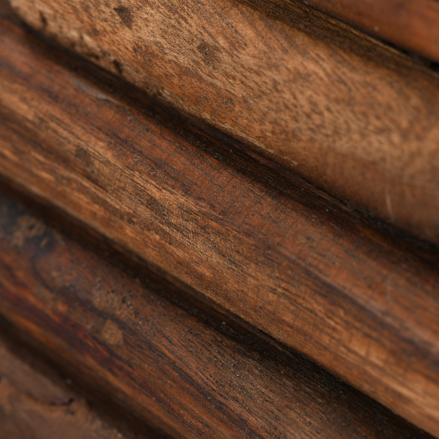 Individual wood pieces create the frame of this mirror. There are short wood pegs with longer pegs surrounding each of the smaller ones. The wood has a variety of shades and shadows making an amazing decorator piece.