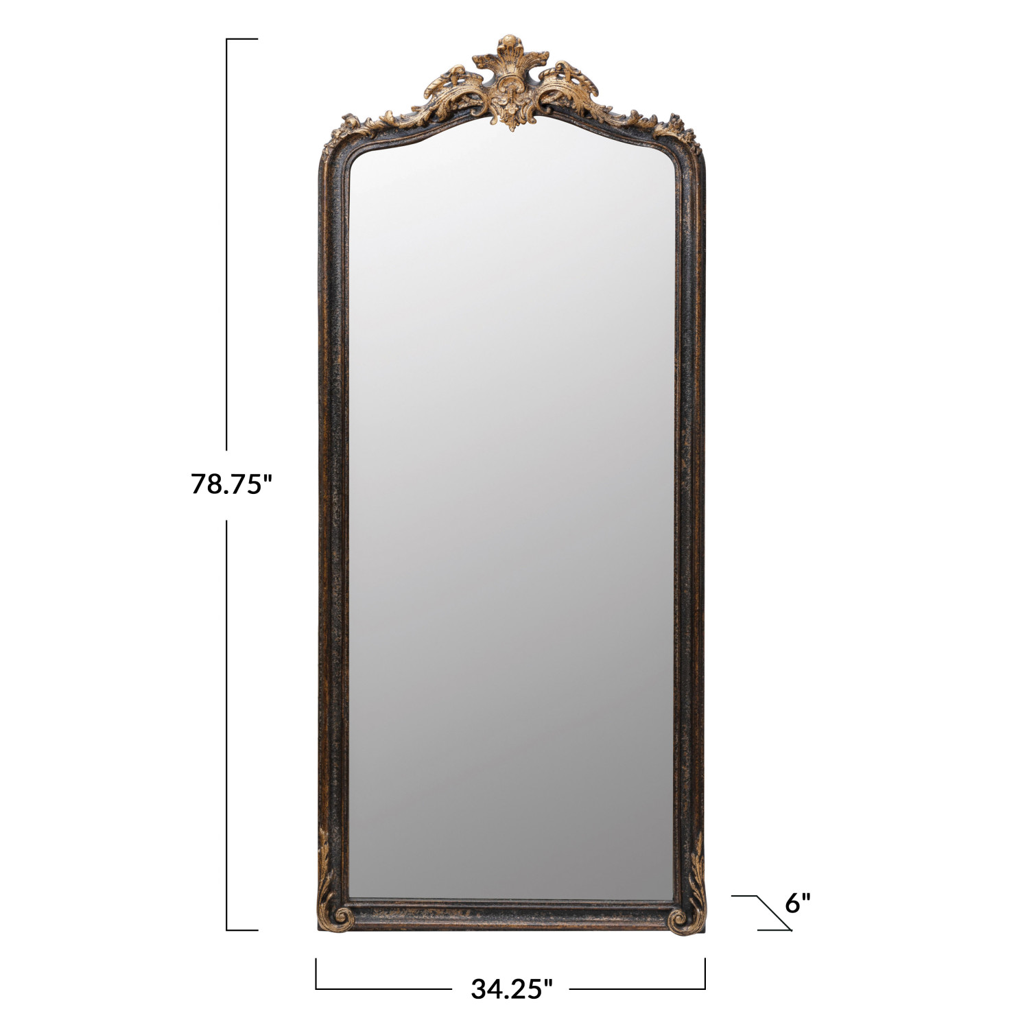 This distressed black and gold resin arch wall mirror adds style and depth to any living space. This artfully crafted mirror features a subtly arched silhouette encased in a bold, intricately carved resin frame with a distressed black and gold finish. The mirror is made of resin for a durable and ornate look. The mirror has hanging mechanisms for easy installation and can be hung vertically only. This mirror is perfect for adding a touch of elegance and drama to any living room, bedroom, or entryway. It measures 34.25 inches wide by 78.75 inches high, making it a perfect size for any space. This mirror is a stunning piece that will add a touch of sophistication to any home.