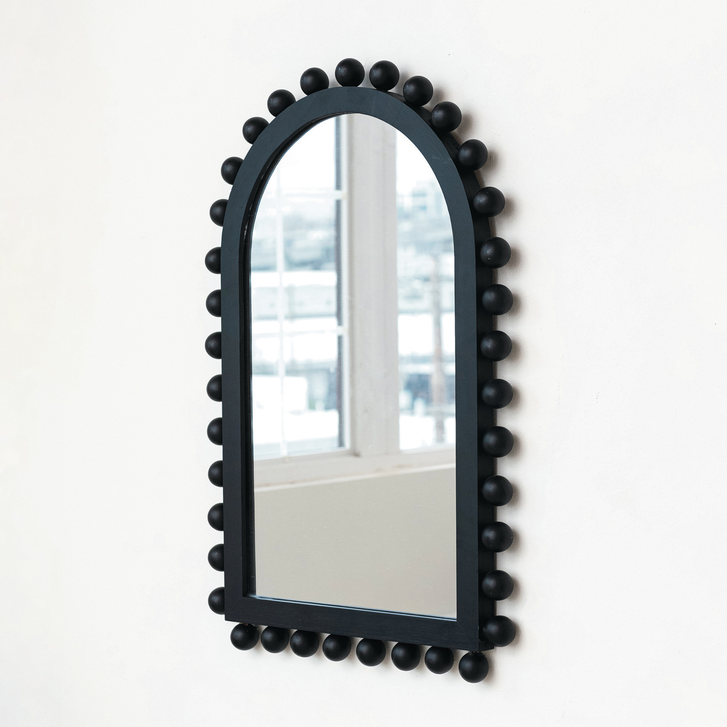Catalog Name: 20-3/4"W x 31-1/2"H Wood Ball Framed Arched Wall Mirror, Black