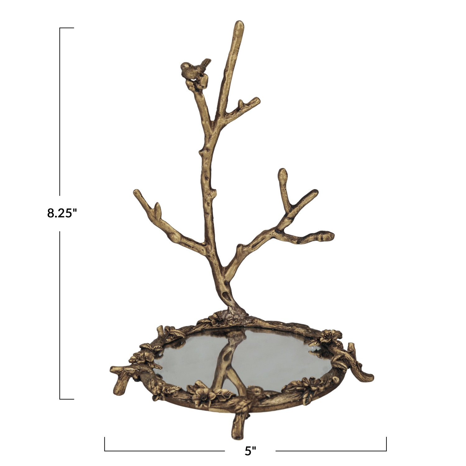 Catalog Name: 5" Round x 8-1/4"H Pewter Jewelry Holder w/ Mirror & Bird on Branch, Antique Gold Finish