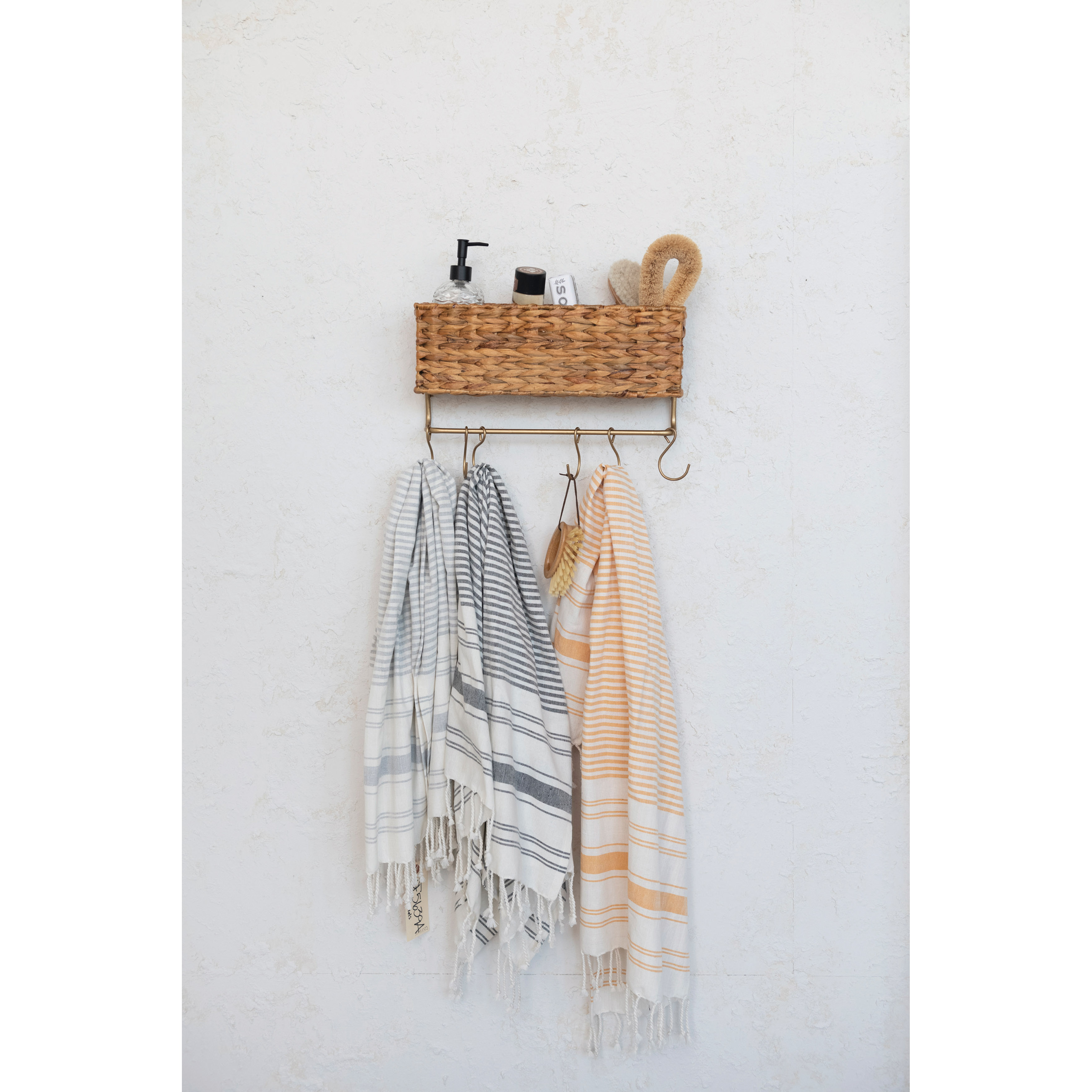 Catalog Name: 16"W x 4-3/4"D x 8-1/2"H Hand-Woven Straw & Metal Wall Basket w/ 4 Sections & 6 Hooks, Natural & Brass Finish